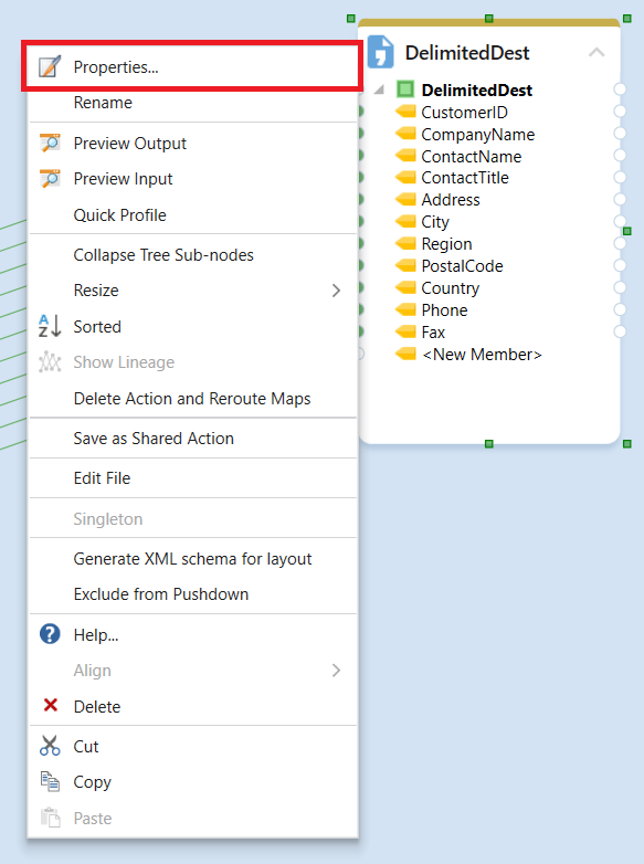 To configure the Delimited File Destination object, right-click on the header, select Properties from the context menu and a dialog box will open.