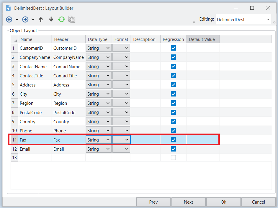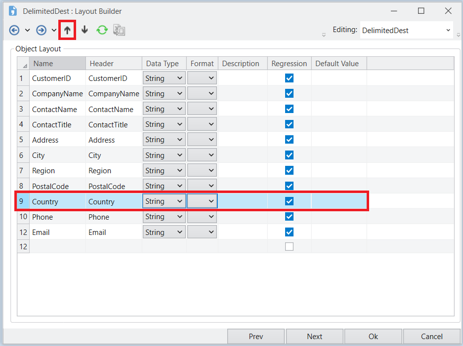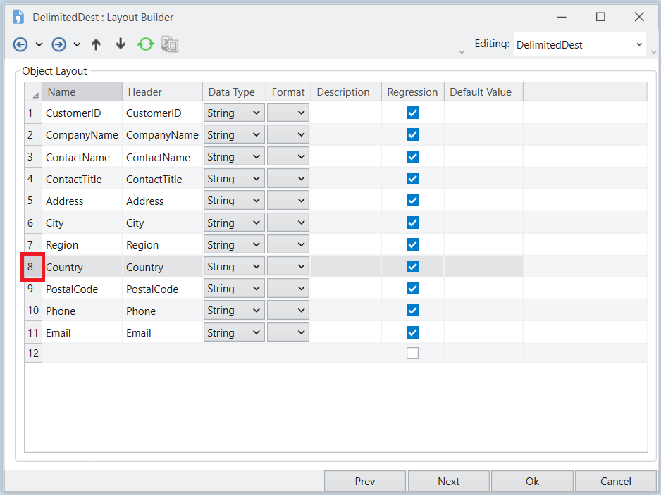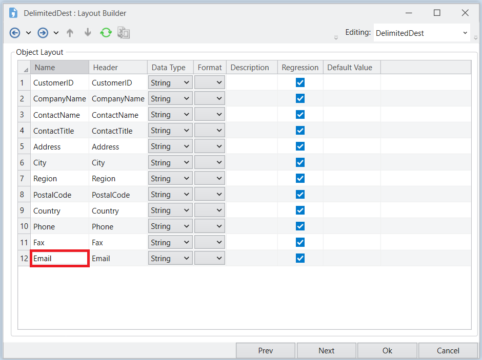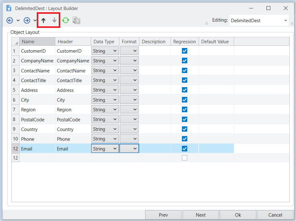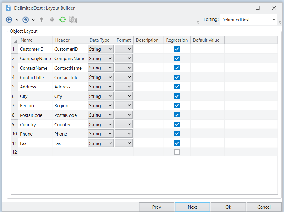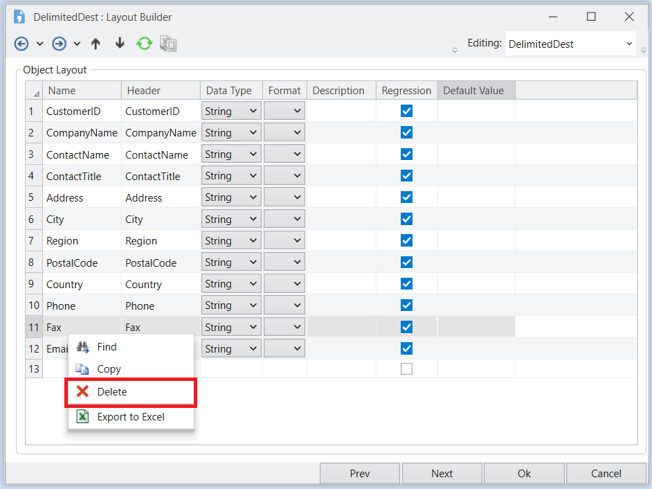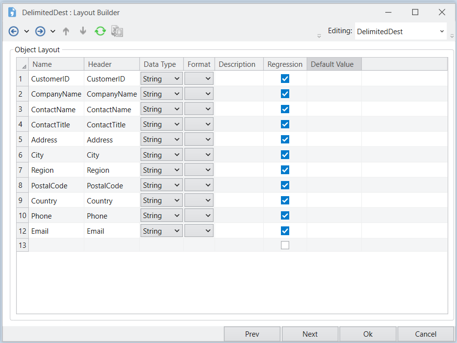 The next window is the Layout Builder. On this window, the layout of the delimited destination file can be modified.