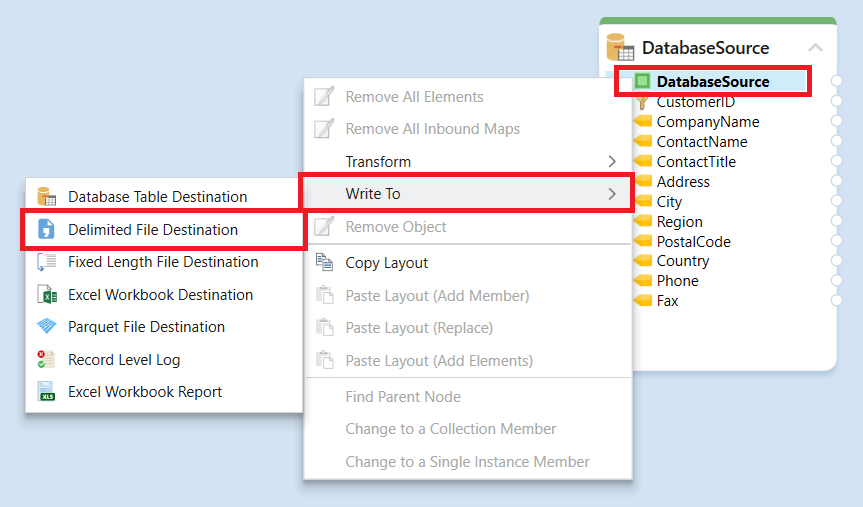 You can also directly write the source layout to a Delimited File Destination through the source context menu of its parent node.