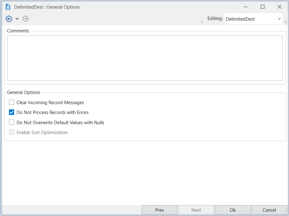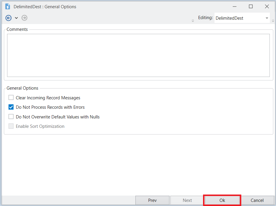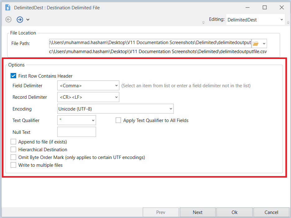 The DelimitedDest object is now configured according to the changes that were made in the properties window.