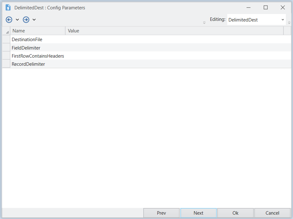 Once the object layout is configured, click Next. A new window will appear, Config Parameters, which allows you to further configure and define parameters for the delimited destination file.