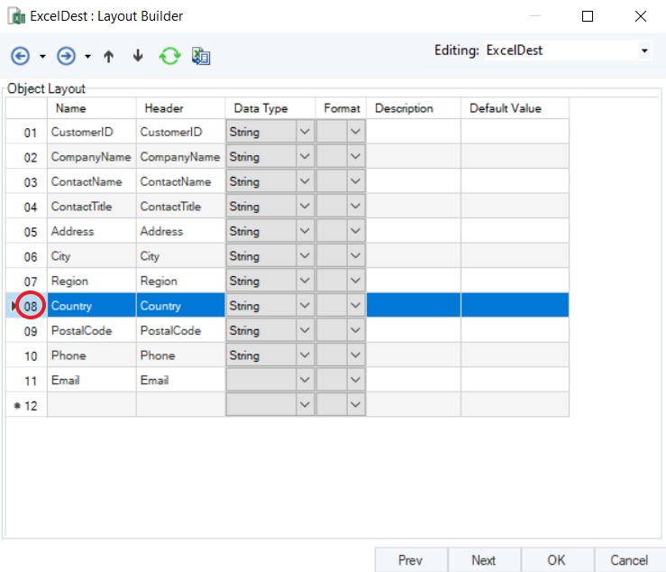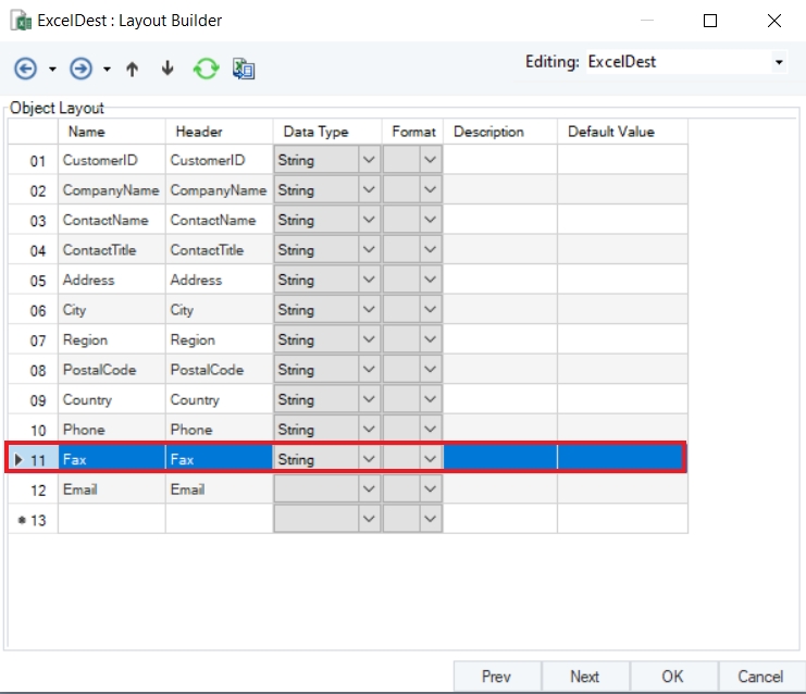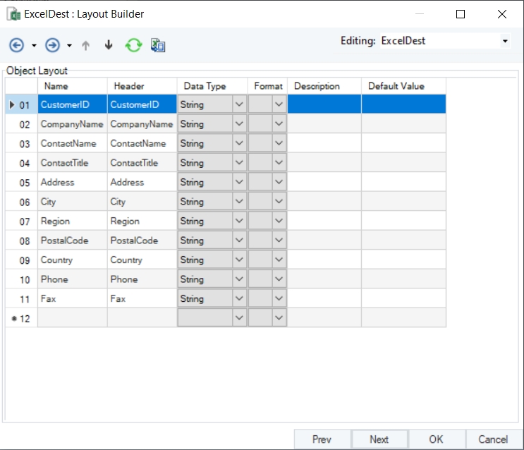 The next window is the Layout Builder. On this window, the layout of the excel destination file can be modified.