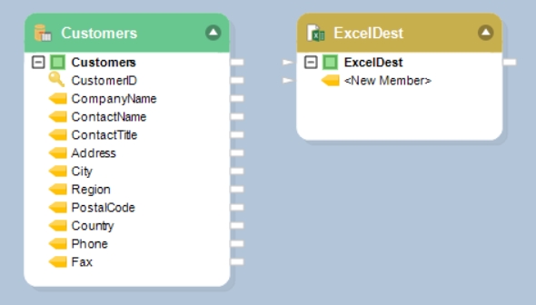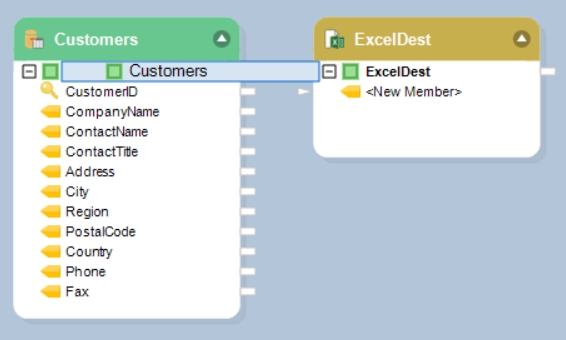 The dragged destination object is empty right now. This is because the data fields are not mapped to it yet. In this case, we will use a simple source to excel destination mapping scenario as an example.