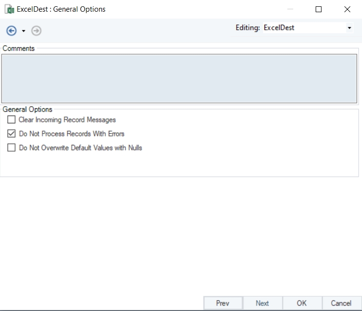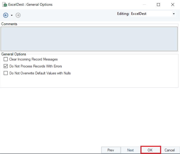 The ExcelDest object is now configured according to the changes that were made in the properties window.