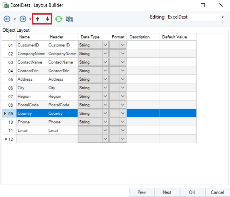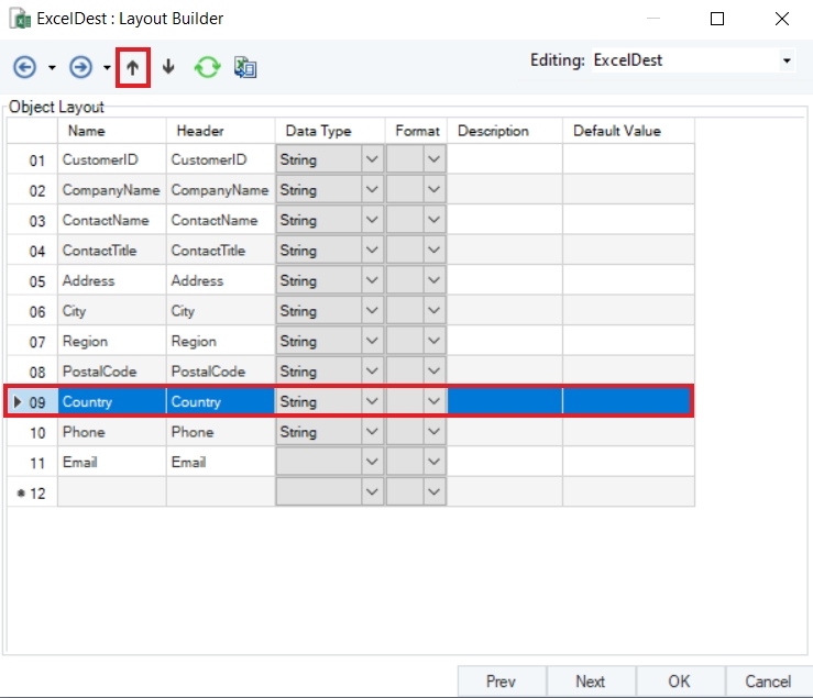 For example: To move the Country field right below the Region field, select the row and use the Move up key to from the 9th row to the 8th row.