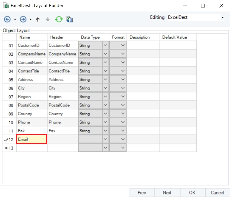 To add a new field to the layout, go to the last row of the layout (Name column), which will be blank and double-click on it, and a blinking text cursor will appear. Type in the name of the field to be added and select the subsequent properties for it. A new field will be added to the source layout.