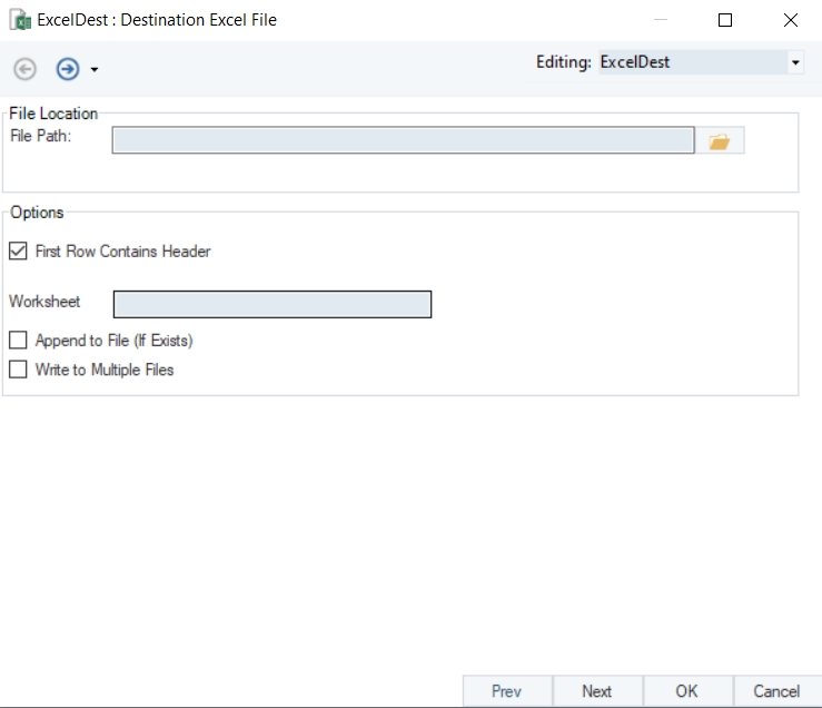 To configure the Excel Workbook Destination object, right-click on the header, select Properties from the context menu and a dialog box will open.