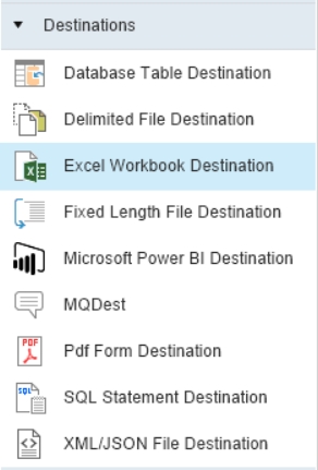 To get the object from the Toolbox, go to Toolbox > Destinations > Excel Workbook Destination. If you are unable to see the Toolbox, go to View > Toolbox or press Ctrl + Alt + X.