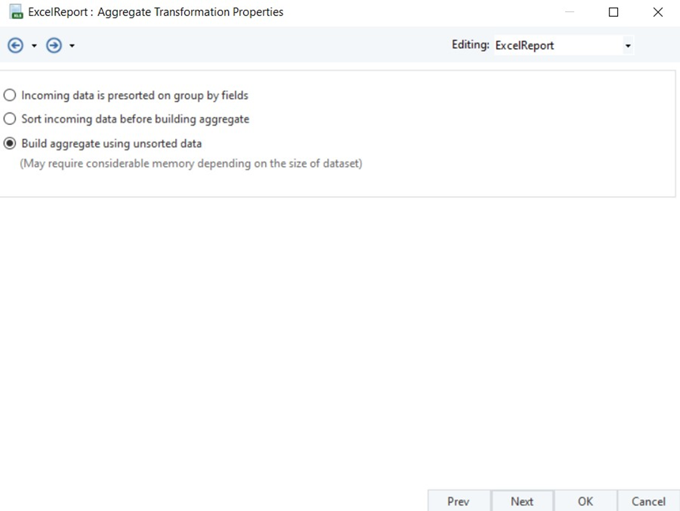 Build aggregate using unsorted data: This option will build aggregate using the incoming data whether it is sorted or not.
