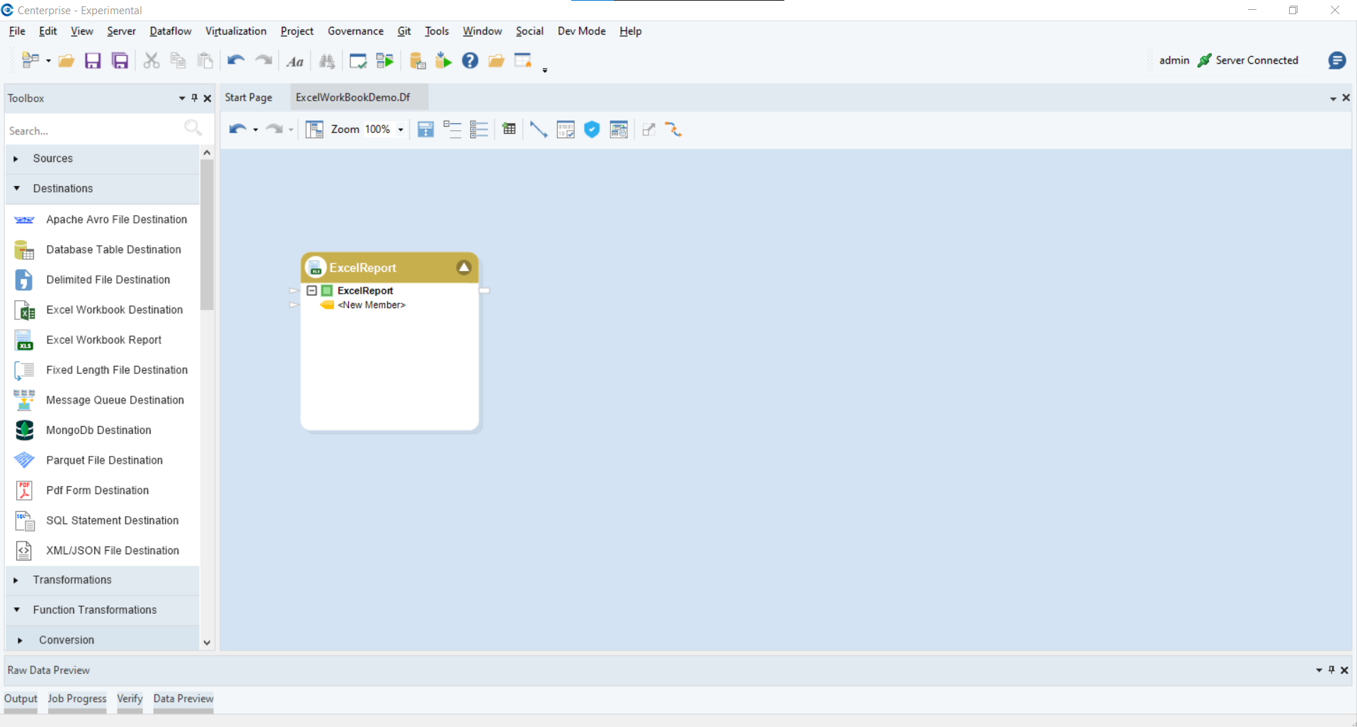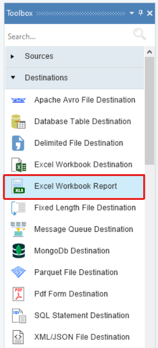 To get the object from the Toolbox, go to Toolbox > Destinations > Excel Workbook Report. If you are unable to see the Toolbox, go to View > Toolbox or press Ctrl + Alt + X.