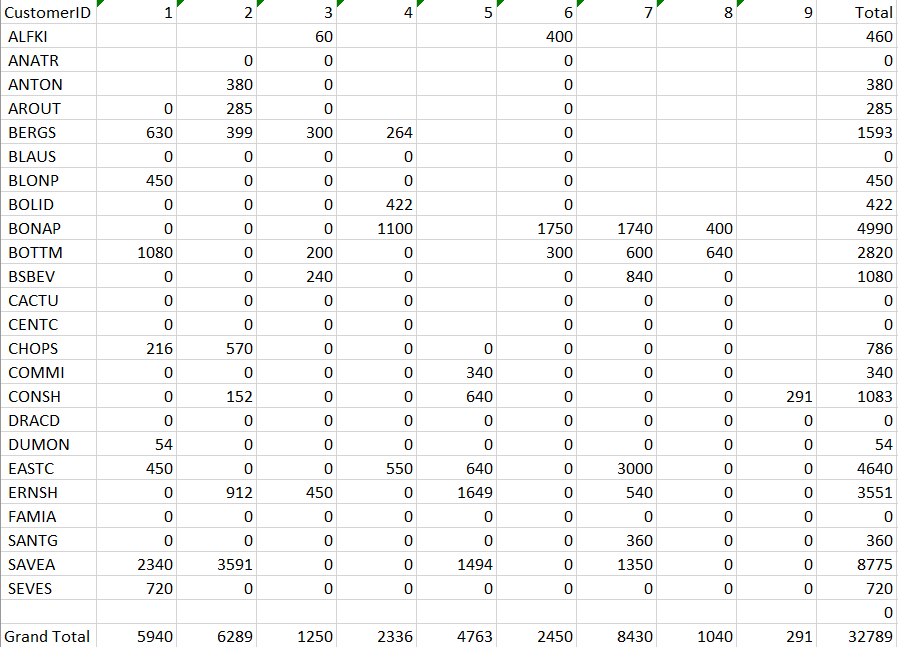 Below, you can see a sample of how the summary report appears. This summary table shows the number of sales across different years for customers, identified by their CustomerID.