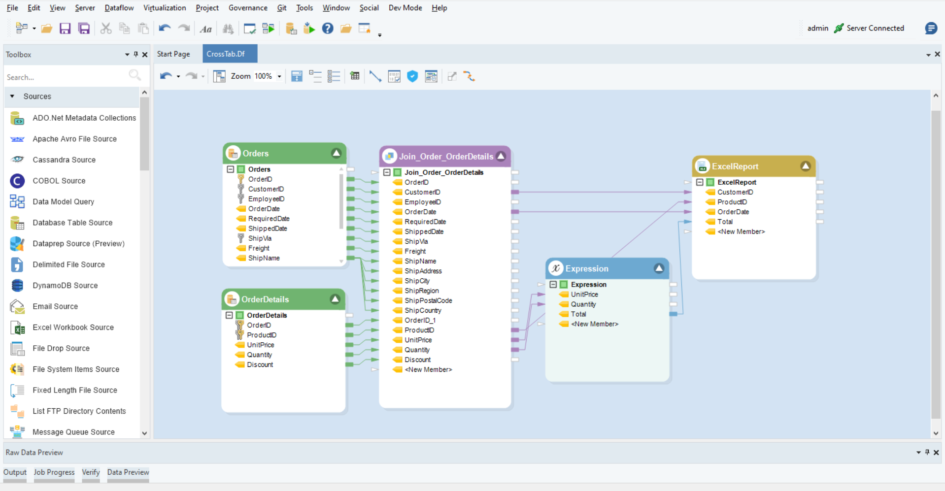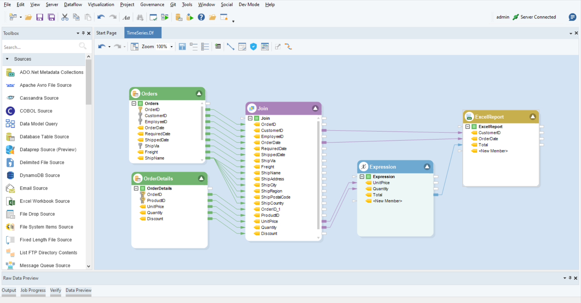 Since we want to use information from two tables (order and order details) we have joined them and to calculate the total we used an expression object. We can then map data fields we needed from both to the Excel Report Object.