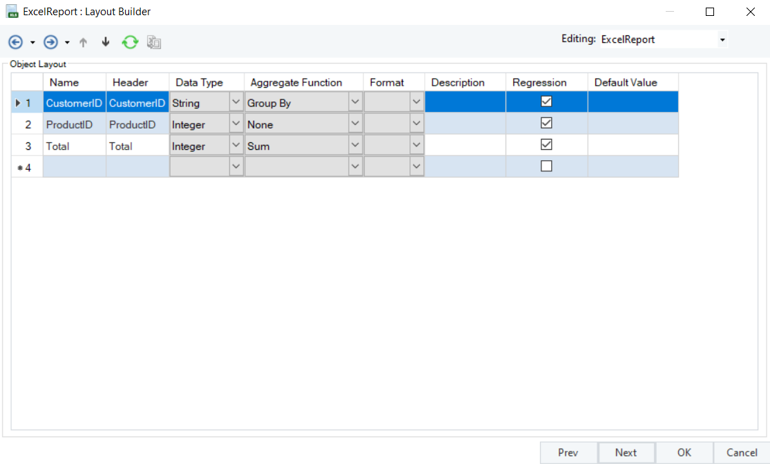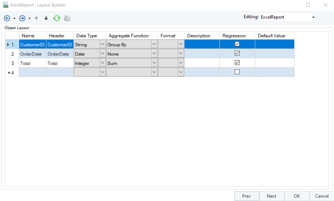 The next window is the Layout Builder. On this window, the layout of the excel report file can be modified.