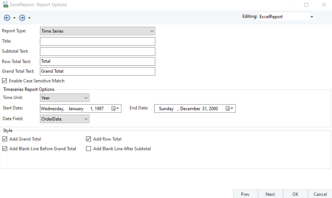 Let’s see how we can make a Time Series Summary using Excel Report Source.