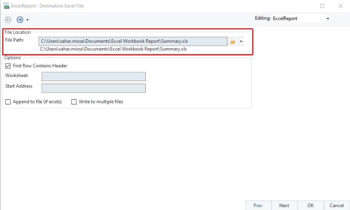 Provide the File Path. This is where the excel report file will be saved.