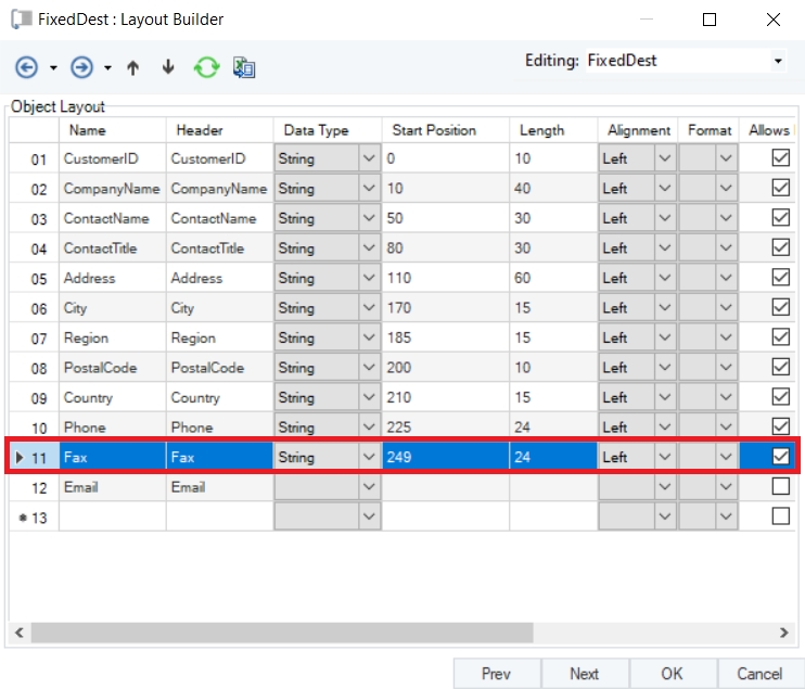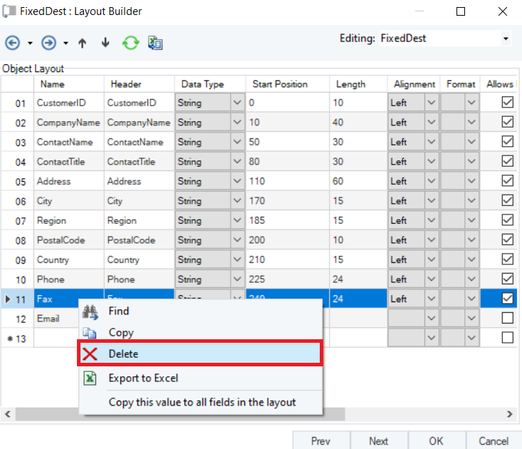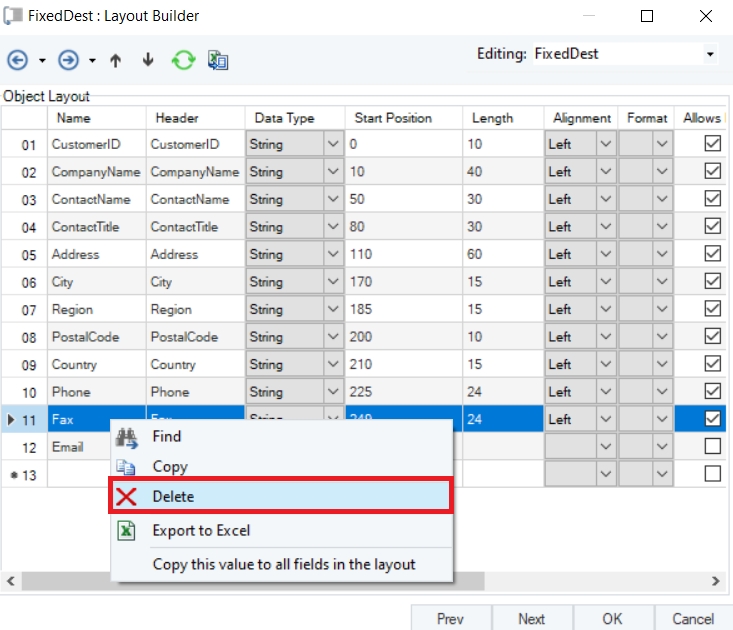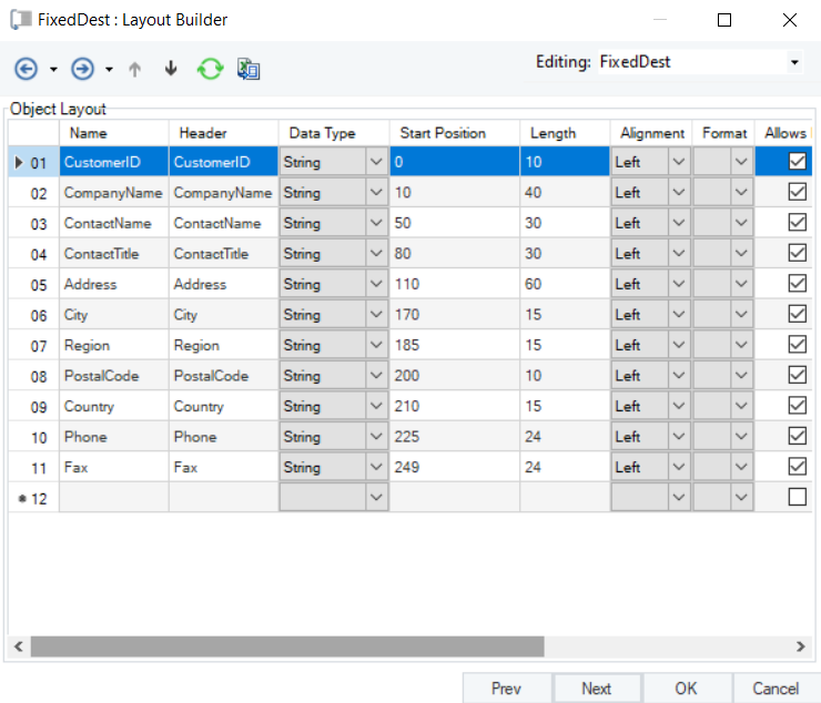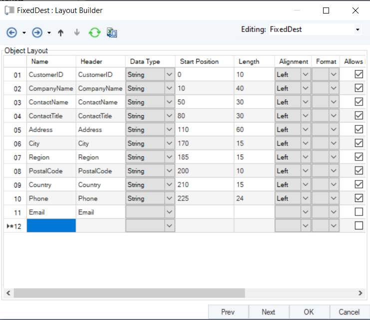 The next window is the Layout Builder. On this window, the layout of the fixed length destination file can be modified.