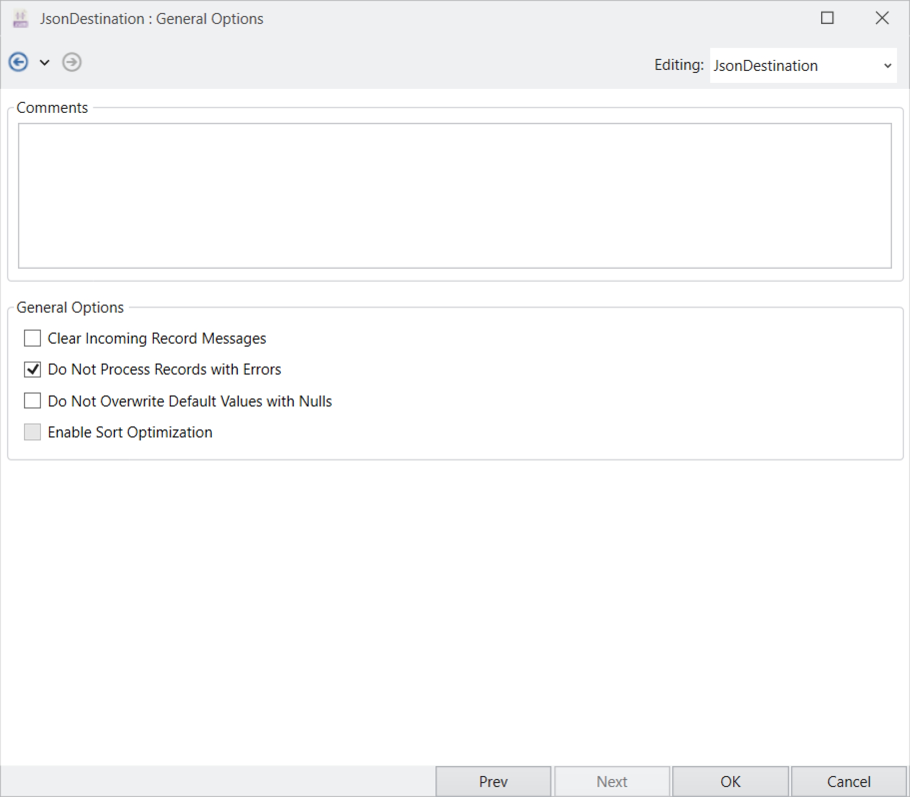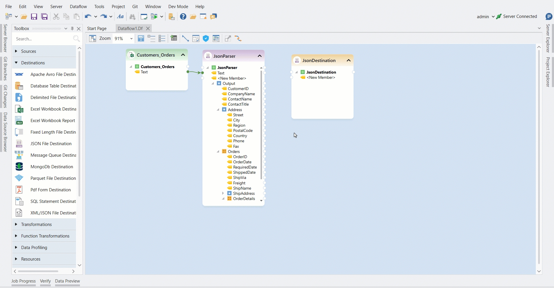 To get started, let’s drag-and-drop a JSON File Destination object from the Toolbox in the Destinations section.