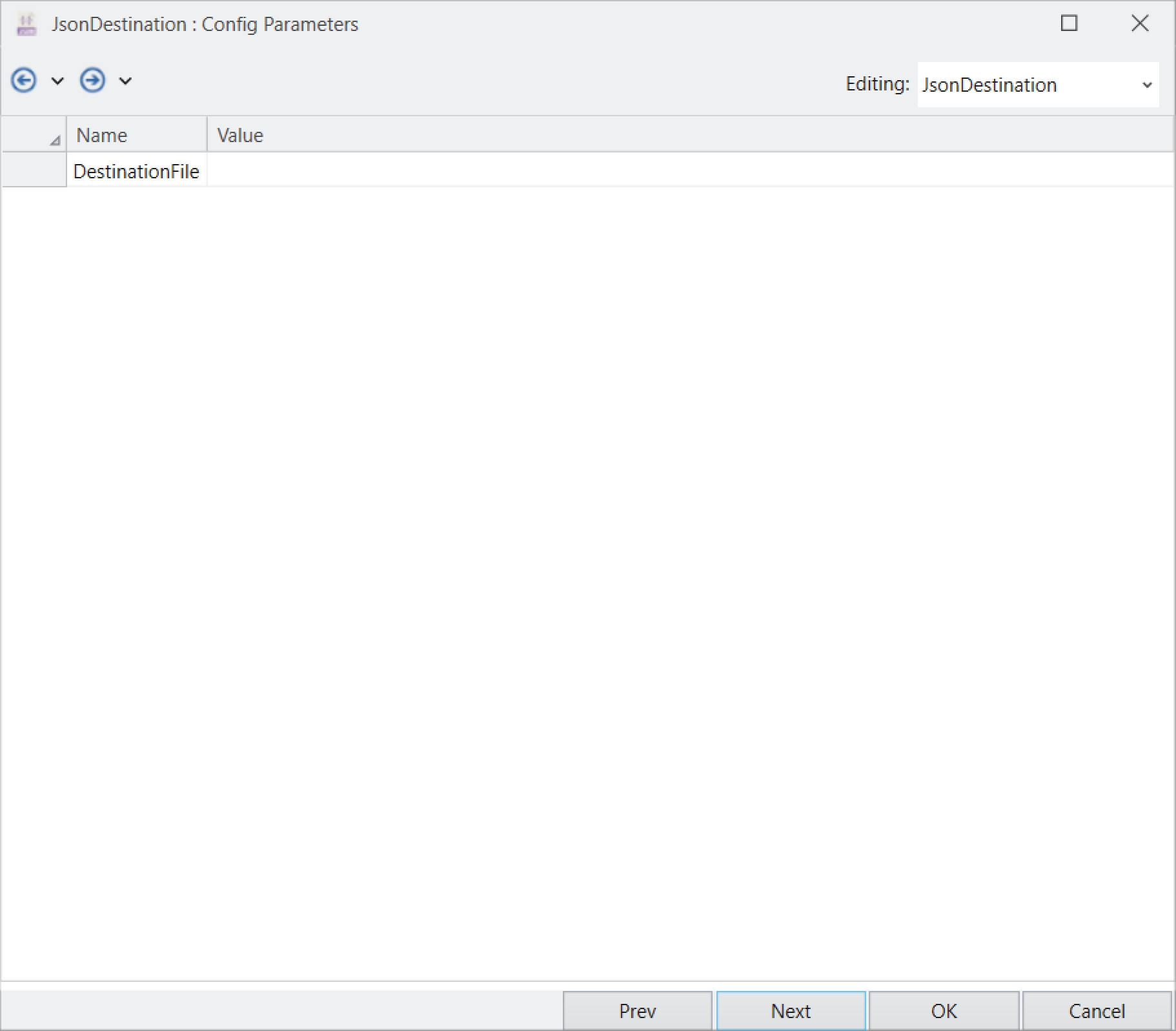 Once the layout has been configured, click Next. A Config Parameters window will open, which will allow us to further configure and define parameters for the JSON Destination object. Parameters can provide easier deployment of flows by eliminating hardcoded values and provide an easier way of changing multiple configurations with a simple value change.
