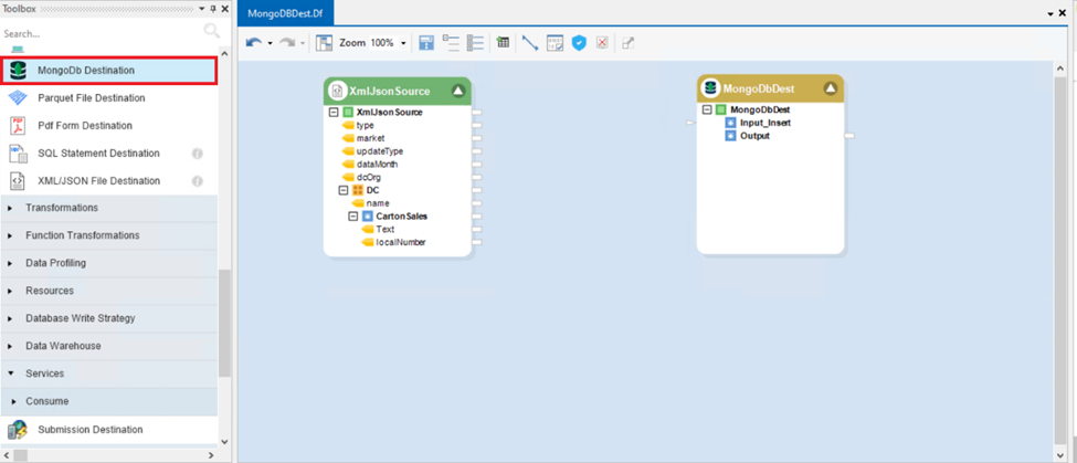 To start, drag-and-drop the MongoDB Destination object from the Destinations section of the Toolbox onto the Dataflow.