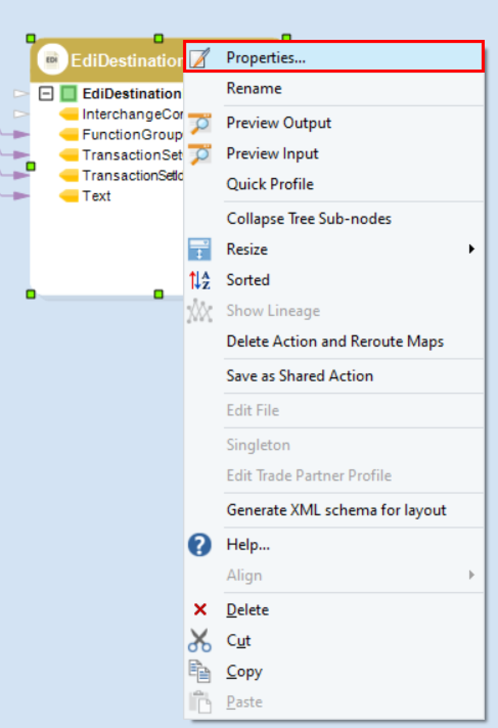 Right-click on the EDI Destination File object’s header and select Properties from the context menu.