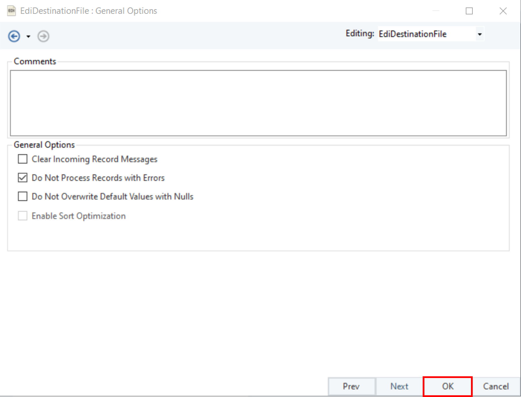 The EDI Destination File object is now configured, and the destination file can now be created by running the Dataflow.