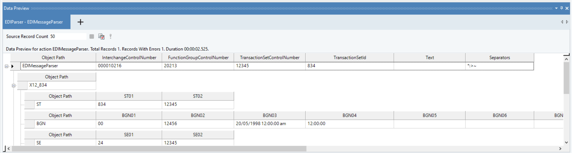 The *Data Preview* window will open. Upon expanding the *EDI Message Parser*, we will be able to see the parsed EDI file in hierarchical format.
