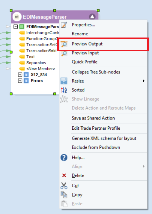17. To preview data, right-click on the header of the *EDI Message Parser* object and select *Preview Output* from the context menu.