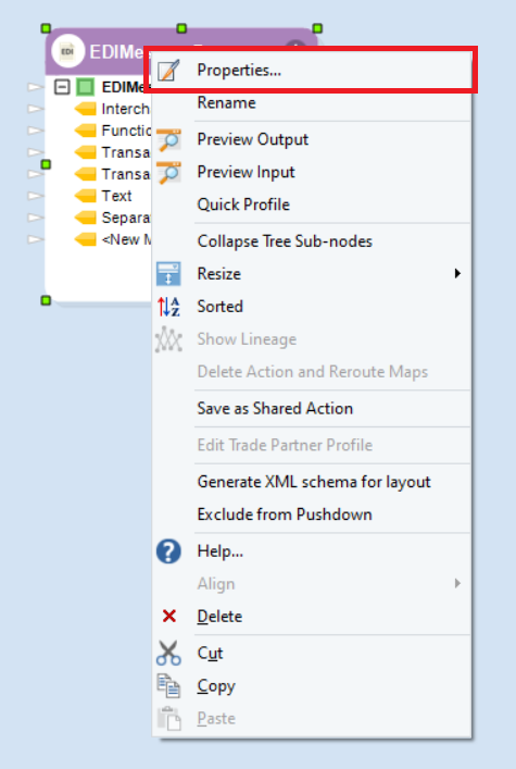 To configure the EDI Message Parser object, right-click on its header and select Properties from the context menu.