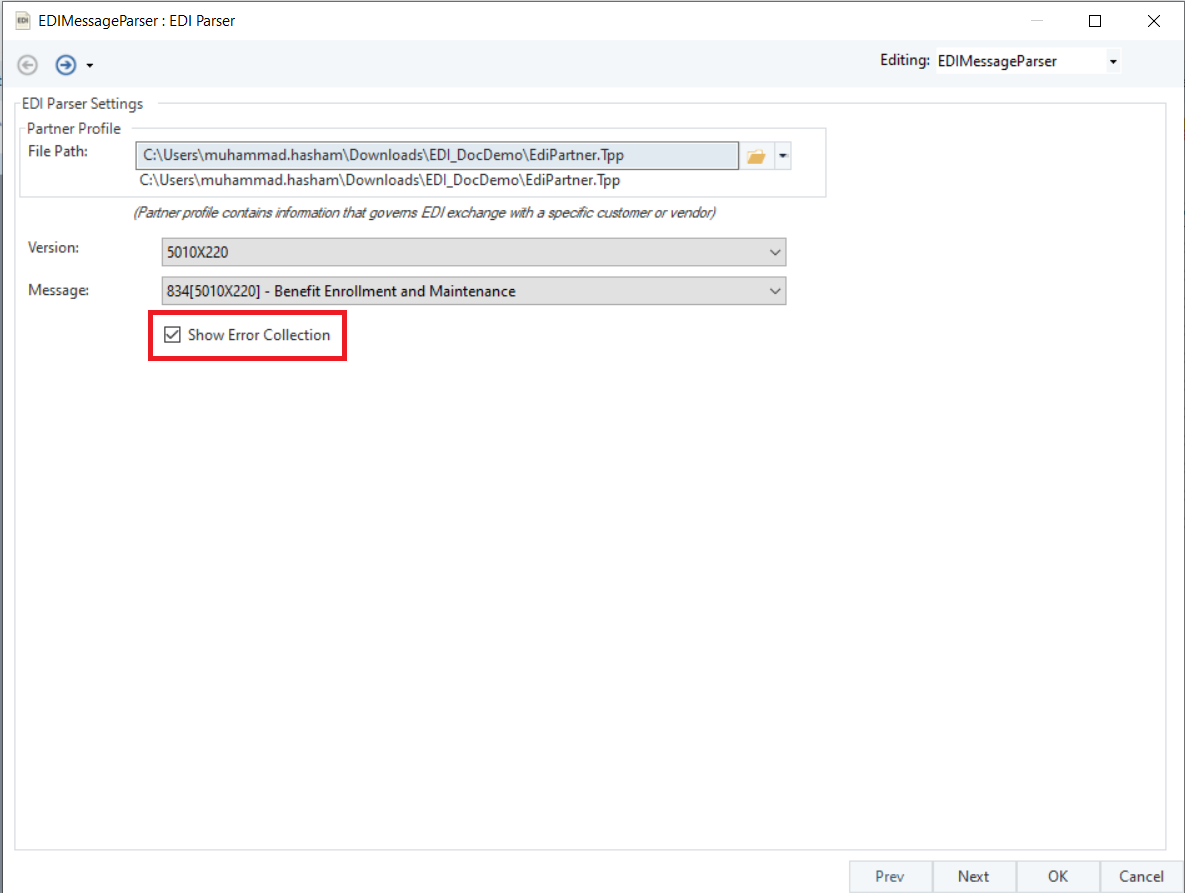 Next, we can enable the Show Error Collection option if we want the system to collect and display errors encountered while parsing the EDI file. It is a useful feature for debugging and ensuring the integrity of the data ingestion process.