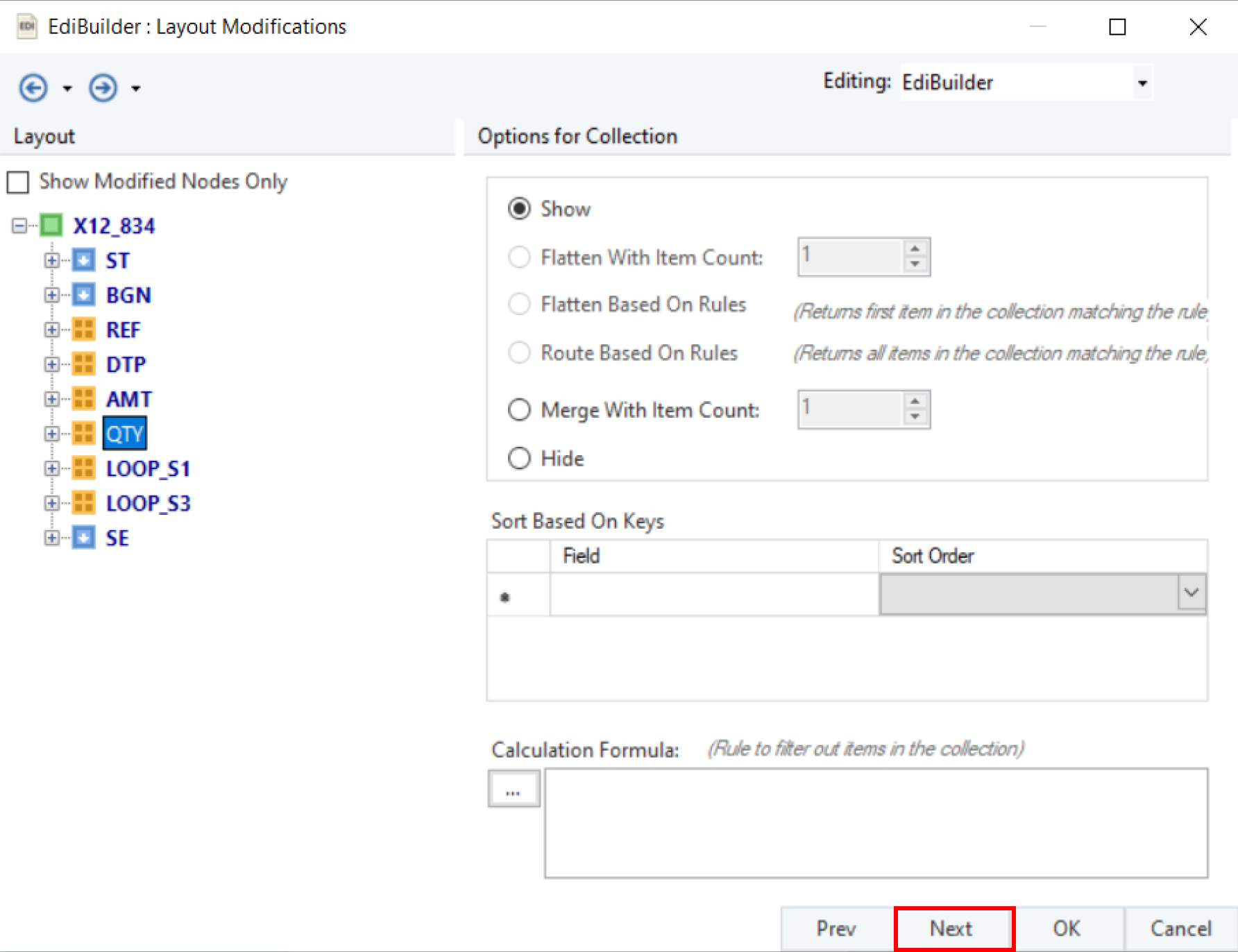 Click *Next*. The *Layout Modifications* screen will open; here, users can choose to show, flatten, hide, sort, or add formulas to each node of the message.