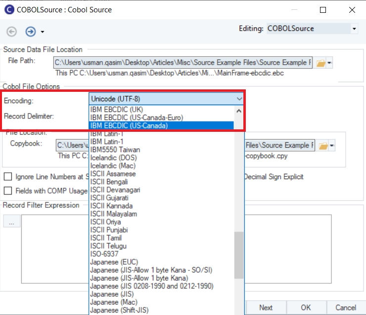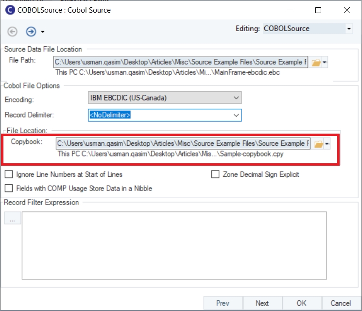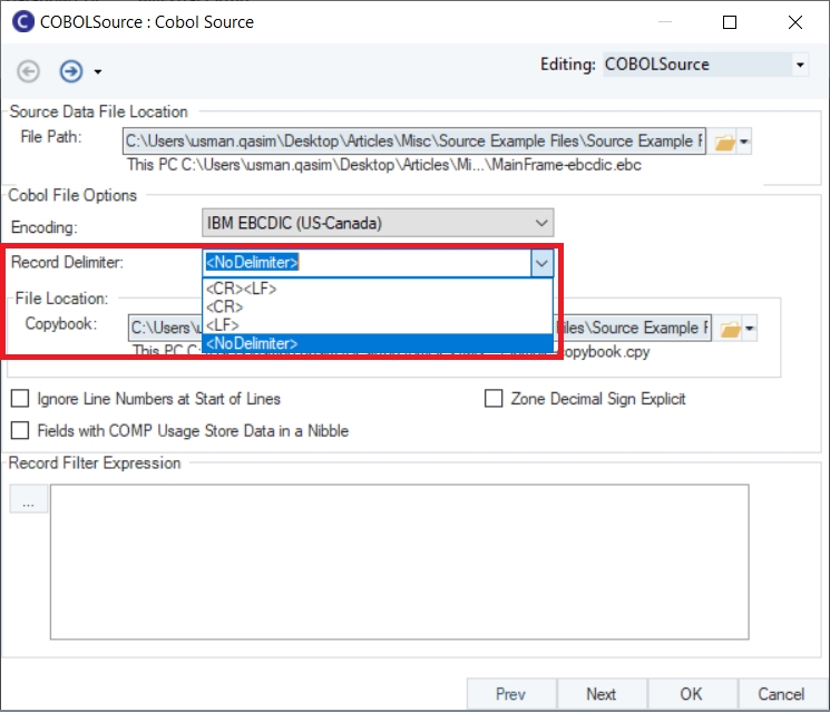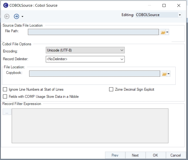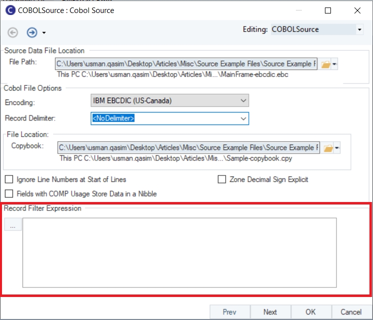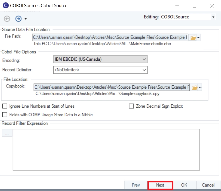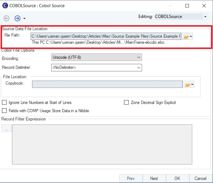Record Filter Expression: Here, we can add a filter expression that we wish to apply to the records in the COBOL File.