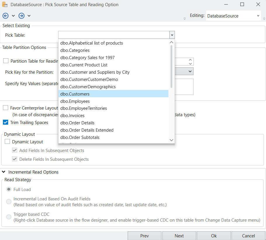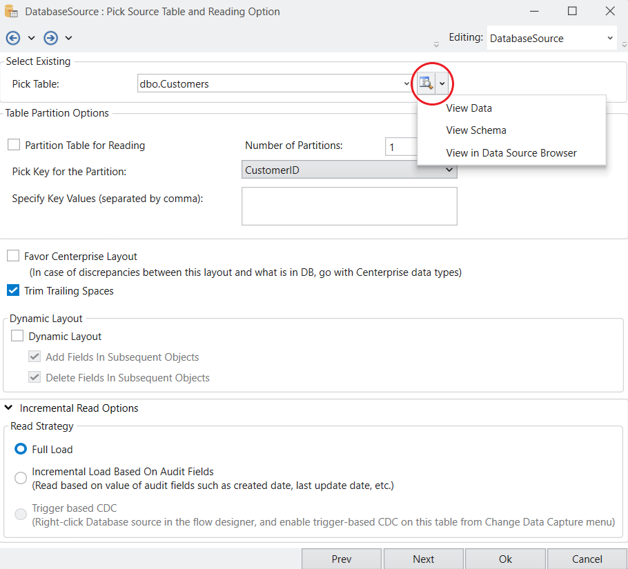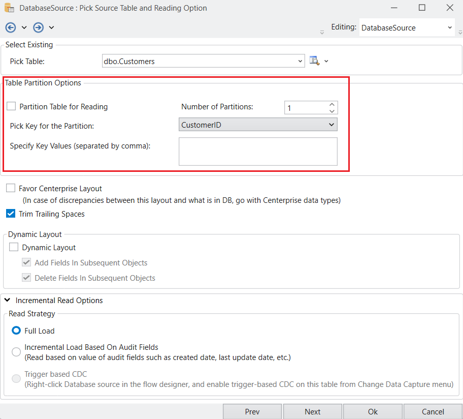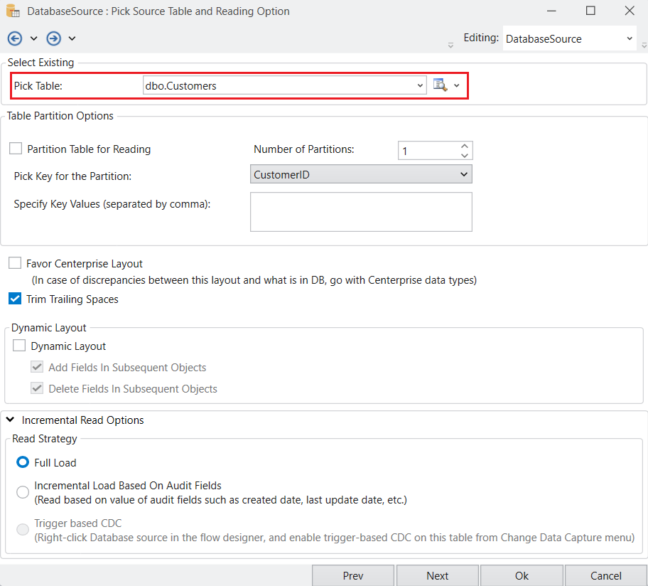 The Database Table Source object provides the functionality to retrieve data from a database table. It also provides change data capture functionality to perform incremental reads, and supports multi-way partitioning, which partitions a database table into multiple chunks and reads these chunks in parallel. This feature brings about major performance benefits for database reads.