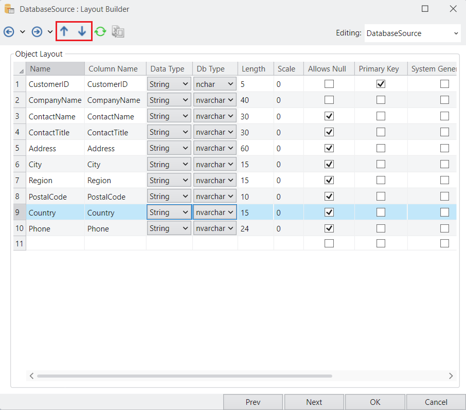 For example: We want to move the Country field right below the Region field. We will select the row and use the Move up key to move the field from the 9th row to the 8th.