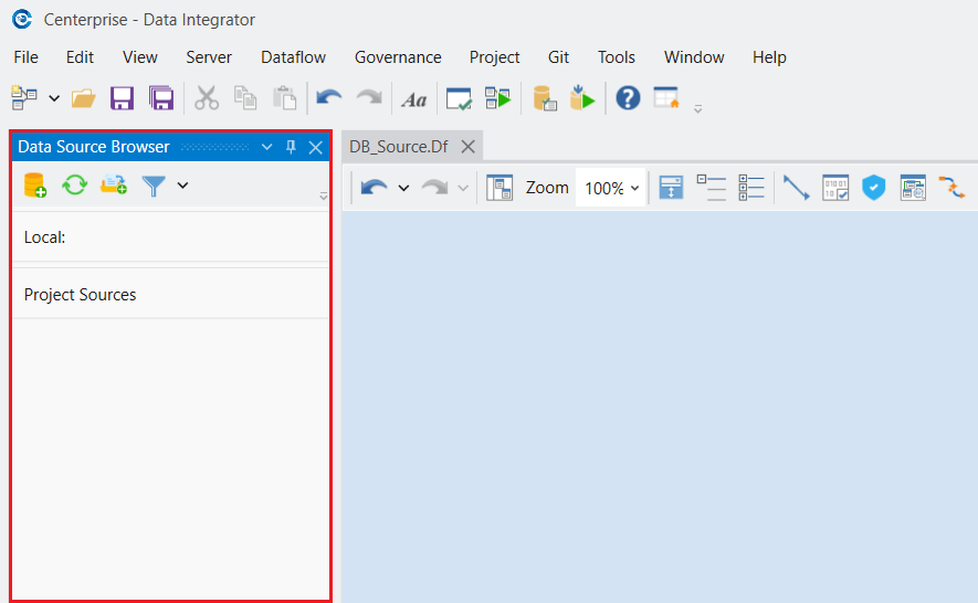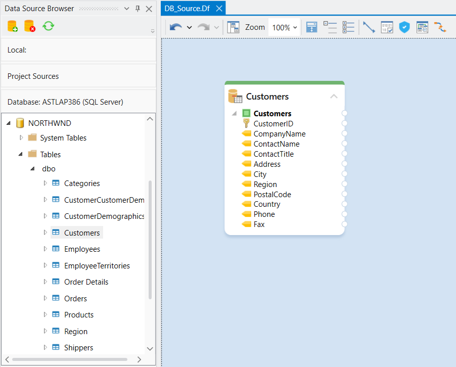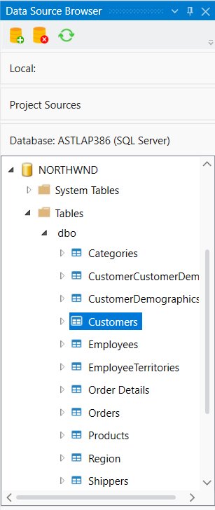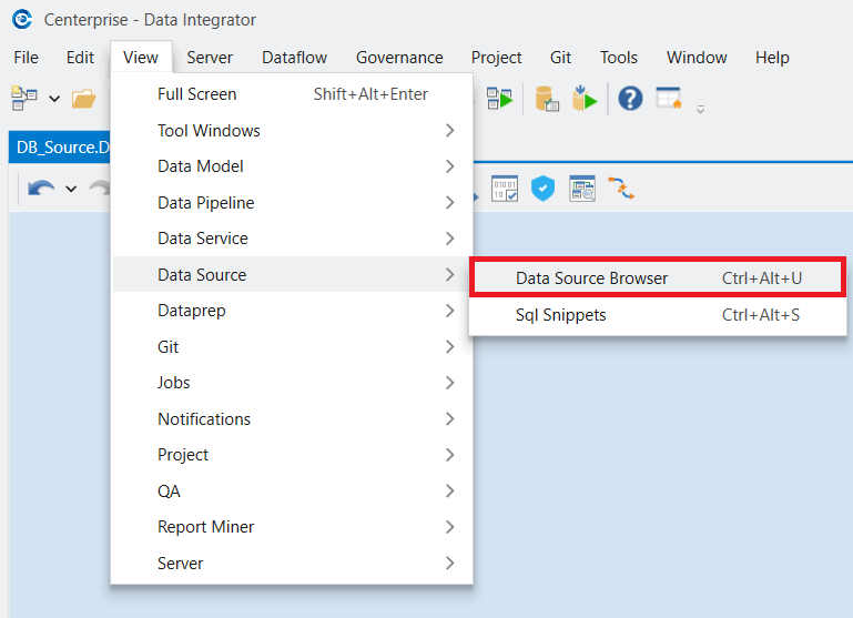 To get the Database Table Source object from the Data Source Browser, go to View > Data Source > Data Source Browser or press Ctrl + Alt + U.