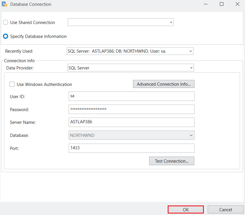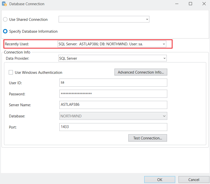 Provide the required credentials. You can also use the Recently Used drop-down menu to connect to a recently connected database.