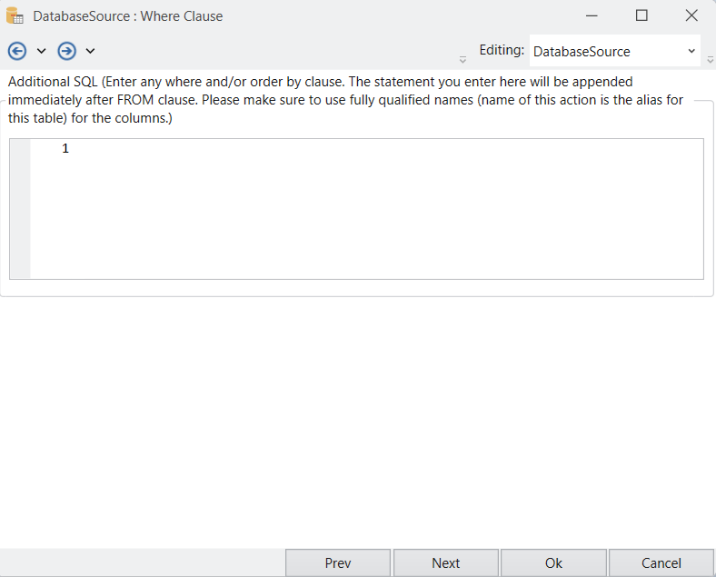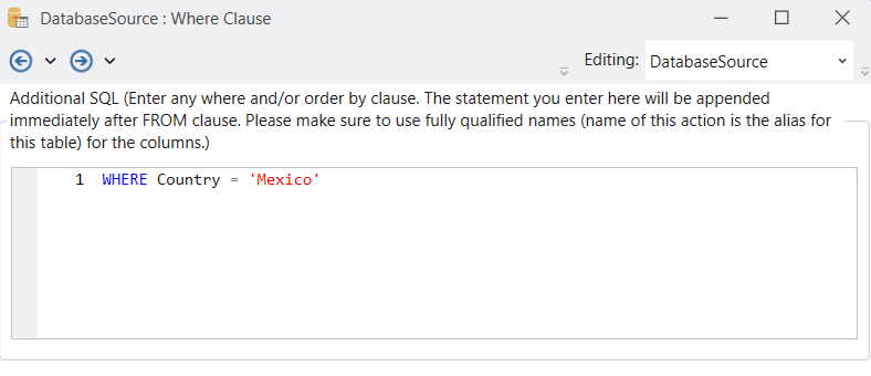 After you are done customizing the Layout Builder, click Next. You will be taken to a new window, Where Clause. Here, you can provide a WHERE clause, which will filter the records from your database table.