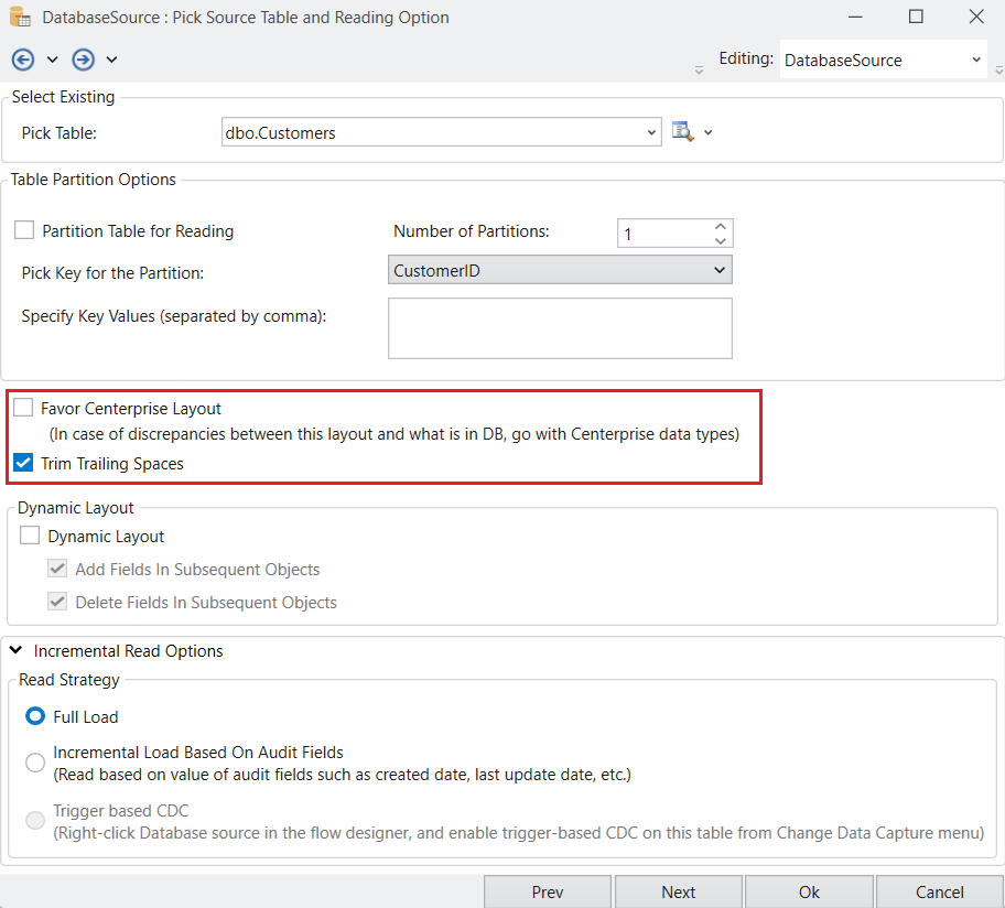 The Favor Centerprise Layout option is useful in cases where your source database table layout has changed over time, but the layout built in Astera is static. And you want to continue to use your dataflows even with the updated source database table layout. You check this option and Astera will favor its own layout over the DB layout.