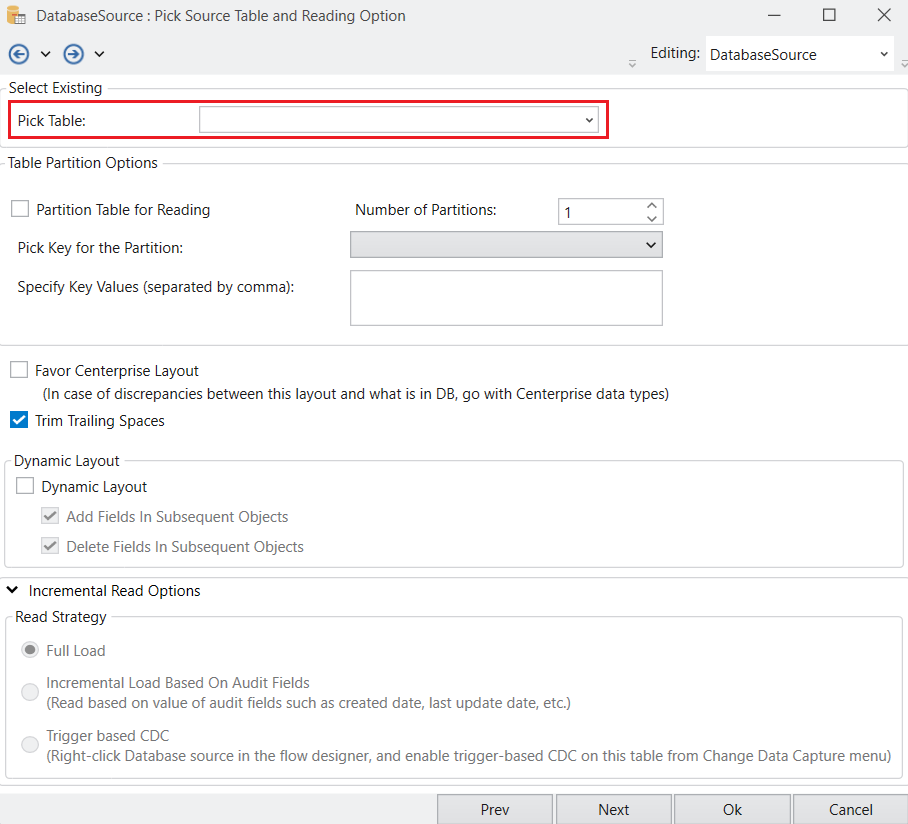 Next, you will see a Pick Source Table and Reading Options window. On this window, you will select the table from the database that you previously connected to and configure the table from the given options.