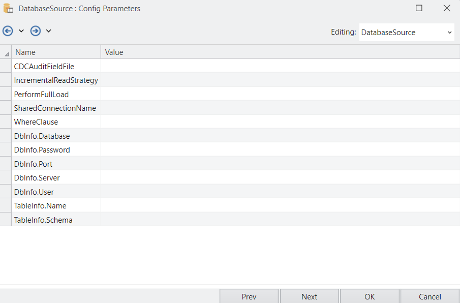 A new window, Config Parameters will open. Here, you can define parameters for the Database Table Source object.