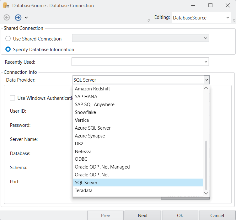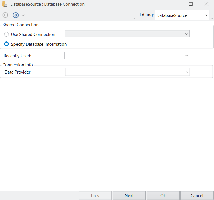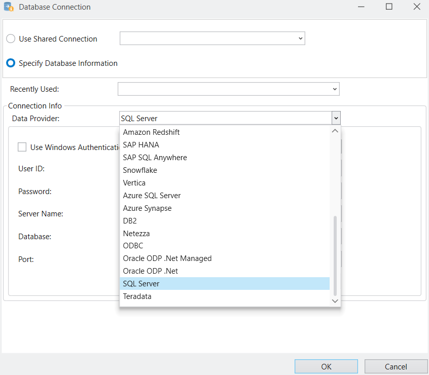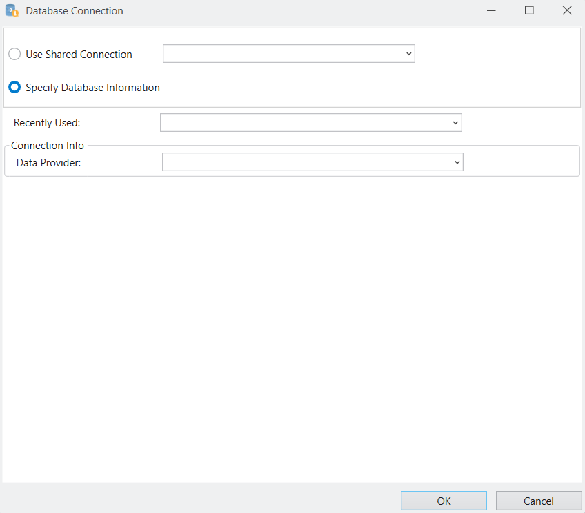 This is where you select the specific database provider to connect to. The connection credentials will vary according to the provider selected.