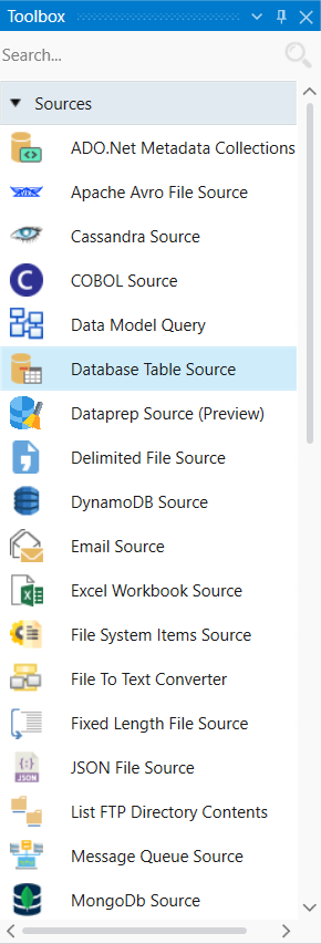 To get a Database Table Source from the Toolbox, go to Toolbox > Sources > Database Table Source. If you are unable to see the Toolbox, go to View > Toolbox or press Ctrl + Alt + X.