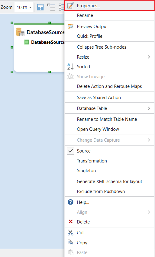To configure the Database Table Source object, right-click on its header and select Properties from the context menu.