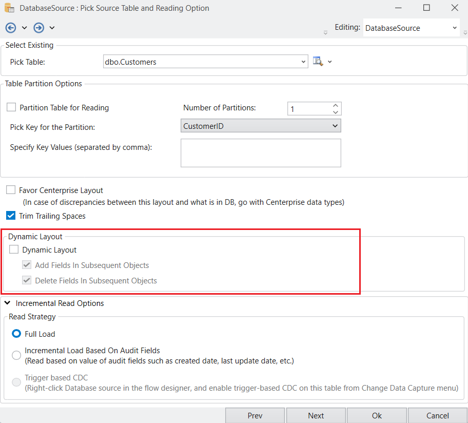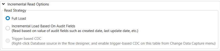 The Database Table Source object provides incremental read functionality based on the concept of audit fields. Incremental read is one of the three change data capture approaches supported by Astera. Audit fields are fields that are updated when a record is created or modified. Examples of audit fields include created date time, modified date time, and version number.