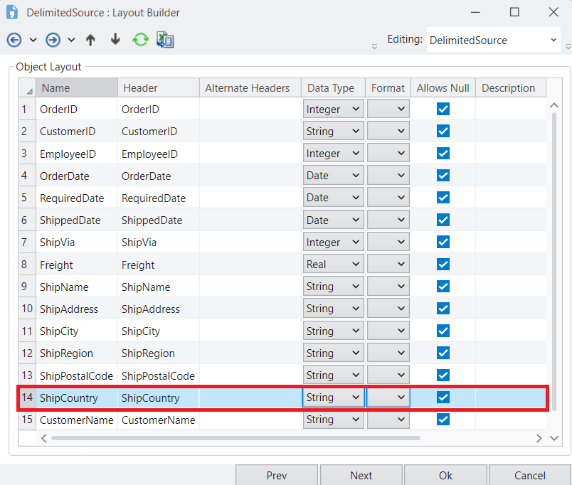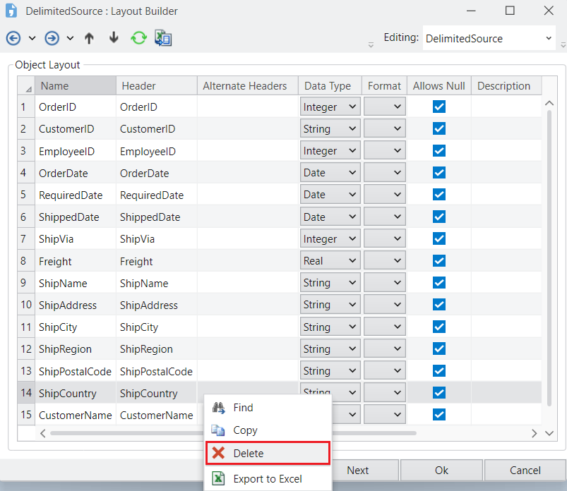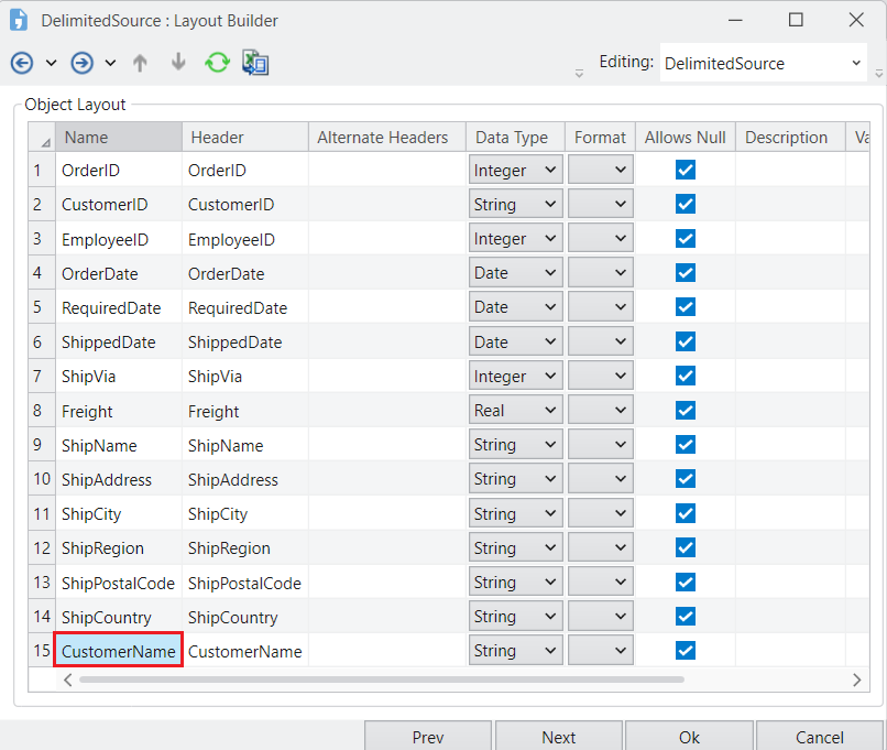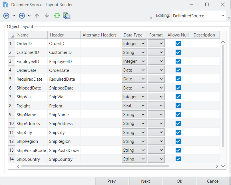 The next window is the Layout Builder. On this window, you can modify the layout of the delimited source file.