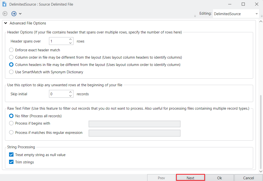 If the source file contains headers, and you want Astera to read headers from the source file, check the File Contains Header option.