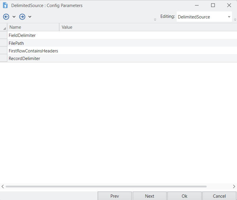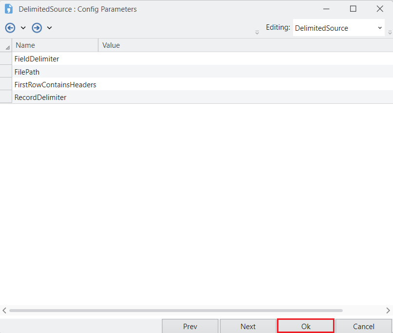 After you are done customizing the layout, click Next. You will be directed to a new window, Config Parameters. Here, you can define parameters for the Delimited File Source object.