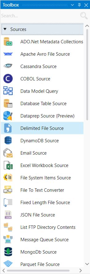 To get a Delimited File Source object from the Toolbox, go to Toolbox > Sources > Delimited File Source. If you are unable to see the Toolbox, go to View > Toolbox or press Ctrl + Alt + X.