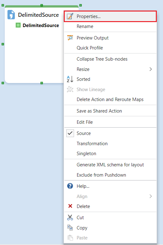 To configure the Delimited File Source object, right-click on its header and select Properties from the context menu.
