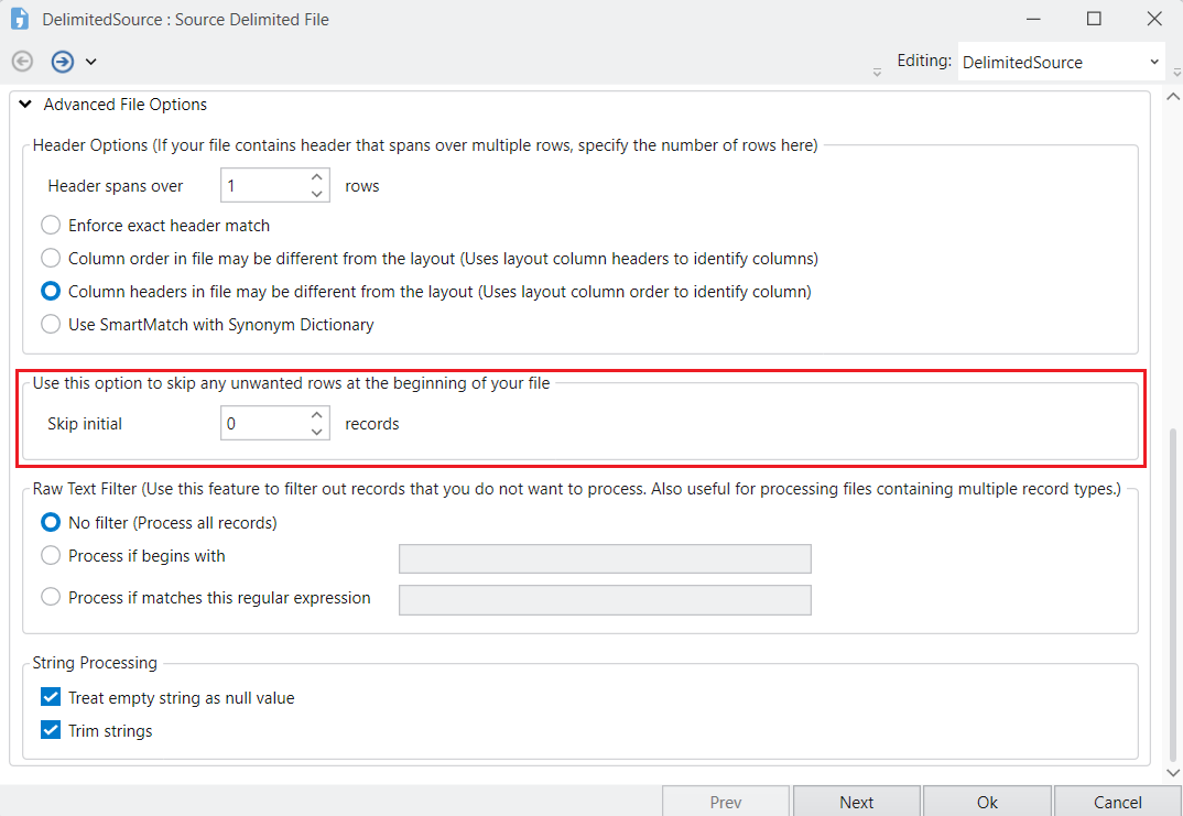 To skip any unwanted rows at the beginning of your file, you can specify the number of records that you want to omit through the Skip initial records option.