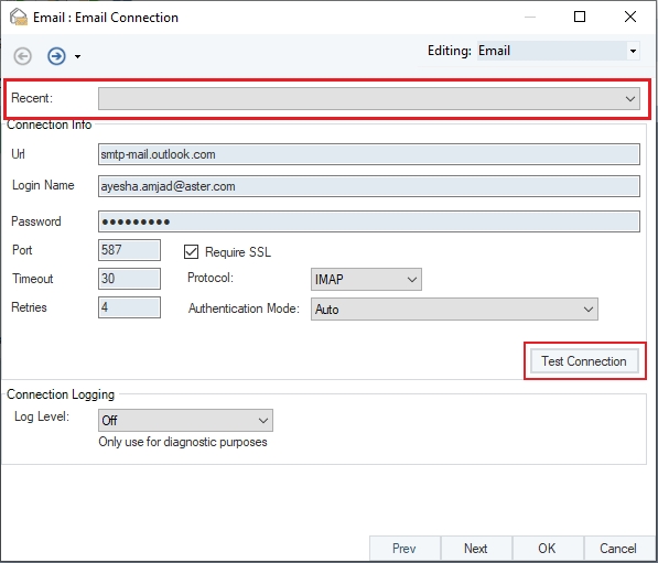 A configuration window for the Email Source object will open. The Email Connection window is where you will specify the connection details.